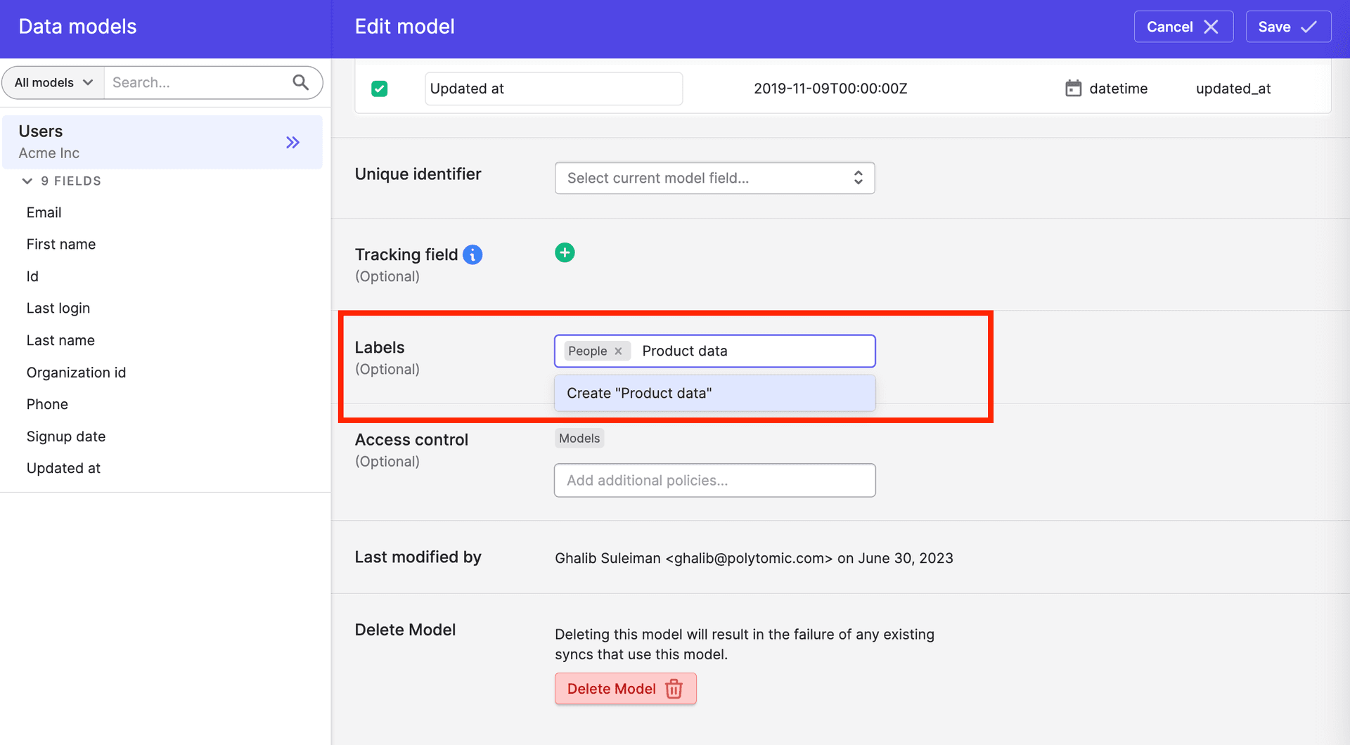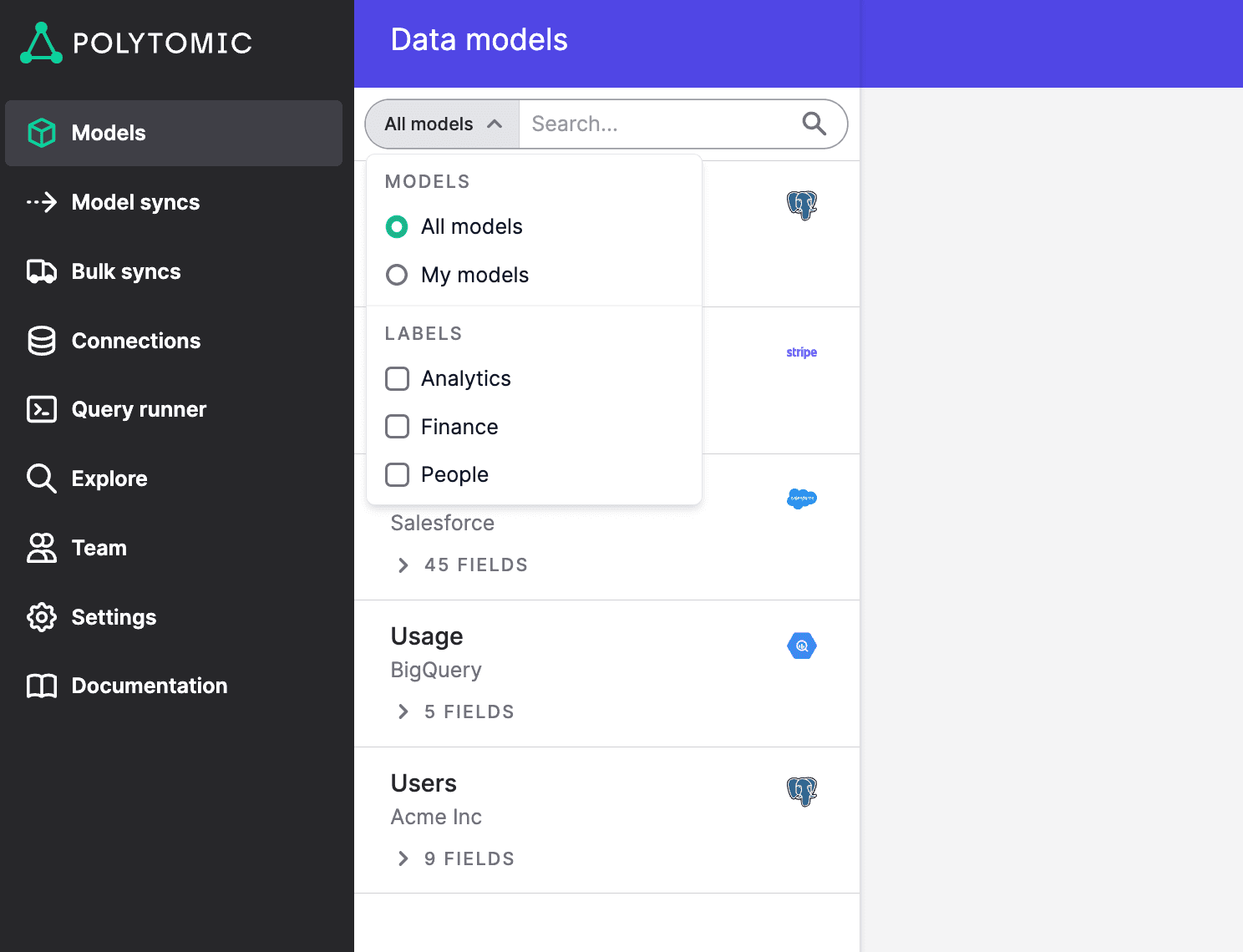 Since Polytomic models can be created from any system, our customers' list of data models can be rather long and varied, covering different categories: product, sales, marketing, finance, support, and so on. This can get unwieldy and calls for a method to organize things!