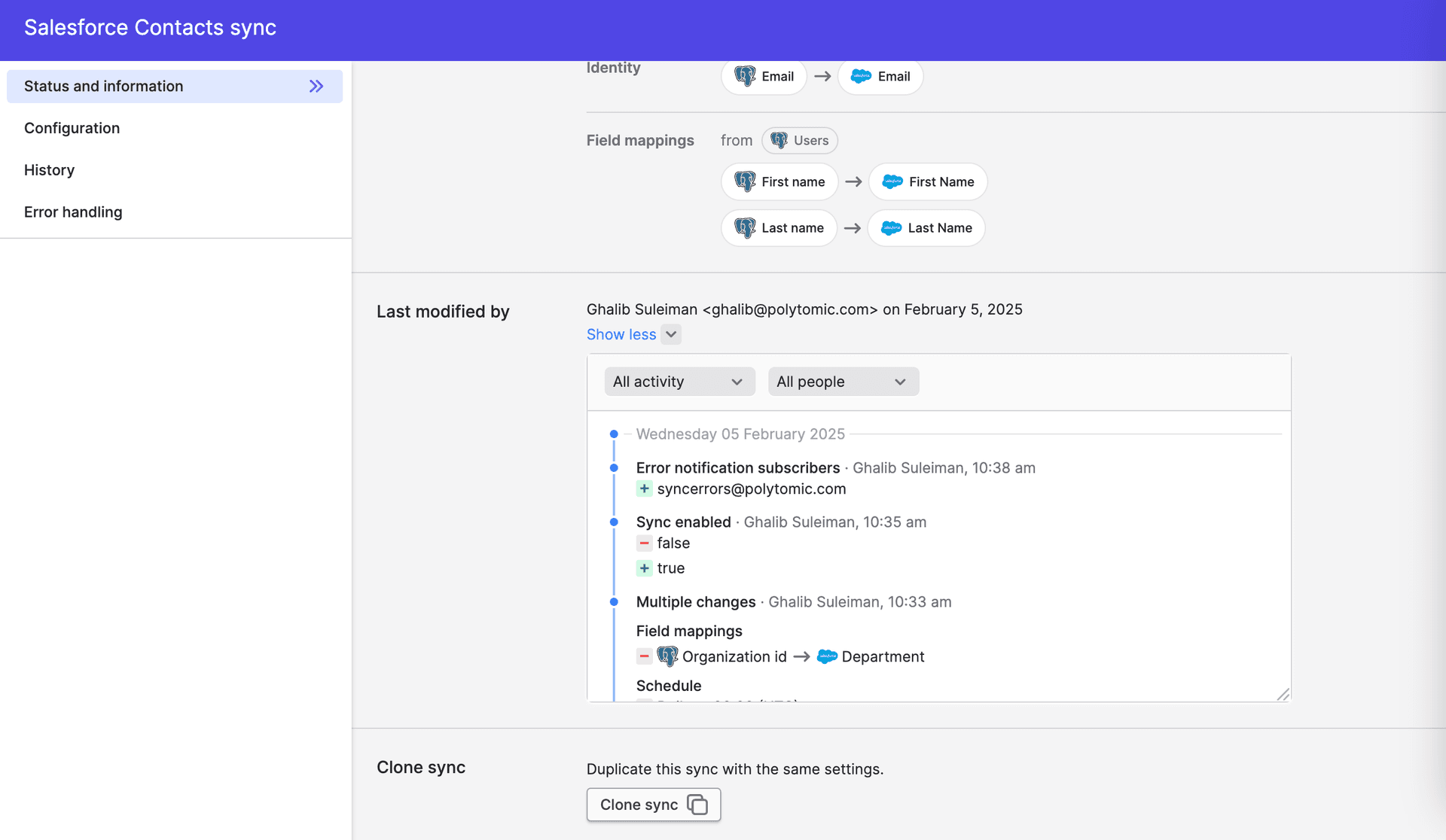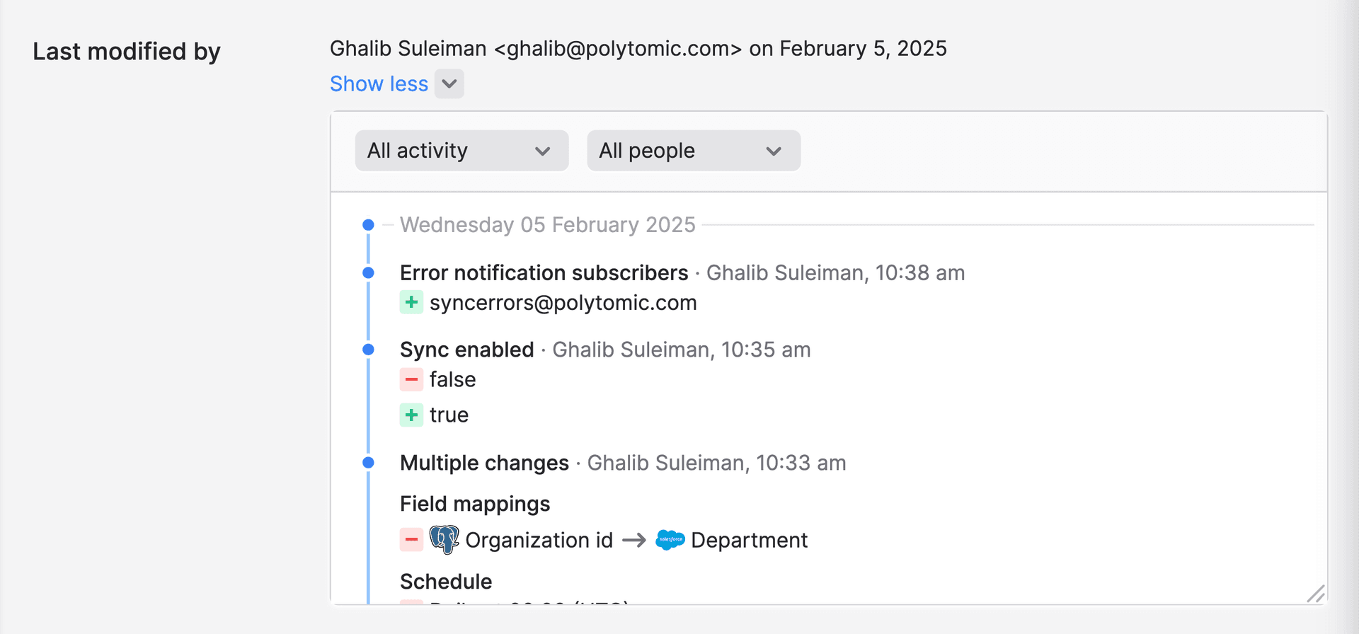 Wondering who removed a field mapping to Salesforce? Or who added you to the error-notification list? Wonder no more, as every Model Sync now comes with a full timeline of configuration changes: