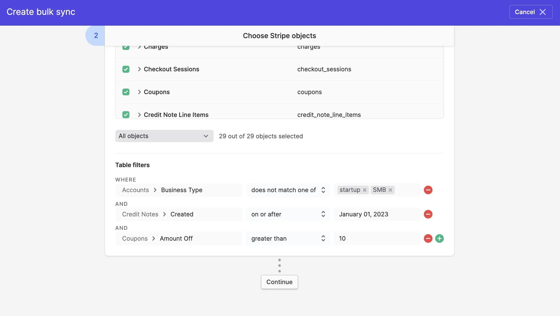 Now, when syncing to your data warehouse using our Bulk Syncs feature, you'll be able to specify any number of filter conditions on any number of source objects and any number of source fields, all in the same sync. This works for all sources: whether CDC SQL database streams, SaaS apps, spreadsheets, or cloud storage like S3.
