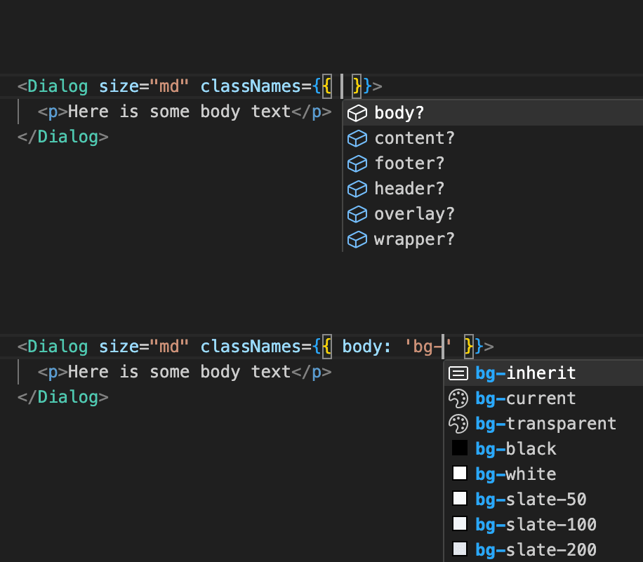 }classNames property, which is keyed by your configured slots and accepts Tailwind strings. It also exposes a getClassNames method which consumes the classNames prop and any variant props to produce the compiled styles.Set up Tailwind VSCode Intellisense